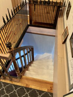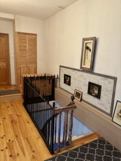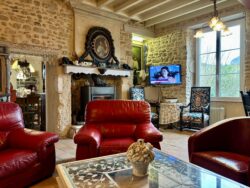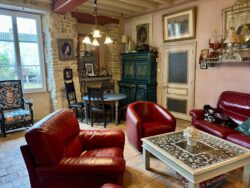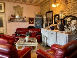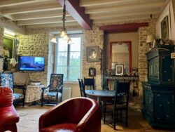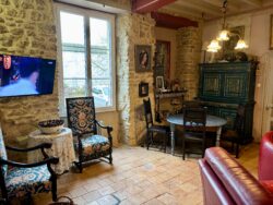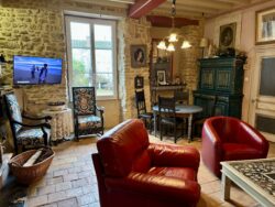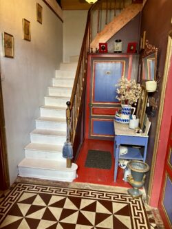 La maison dispose d’une cuisine équipée, d’un grand salon, une salle à manger, un hall d’entrée avec escalier (un WC en bas) et une buanderie (sèche linge, lave linge, fer à repasser).