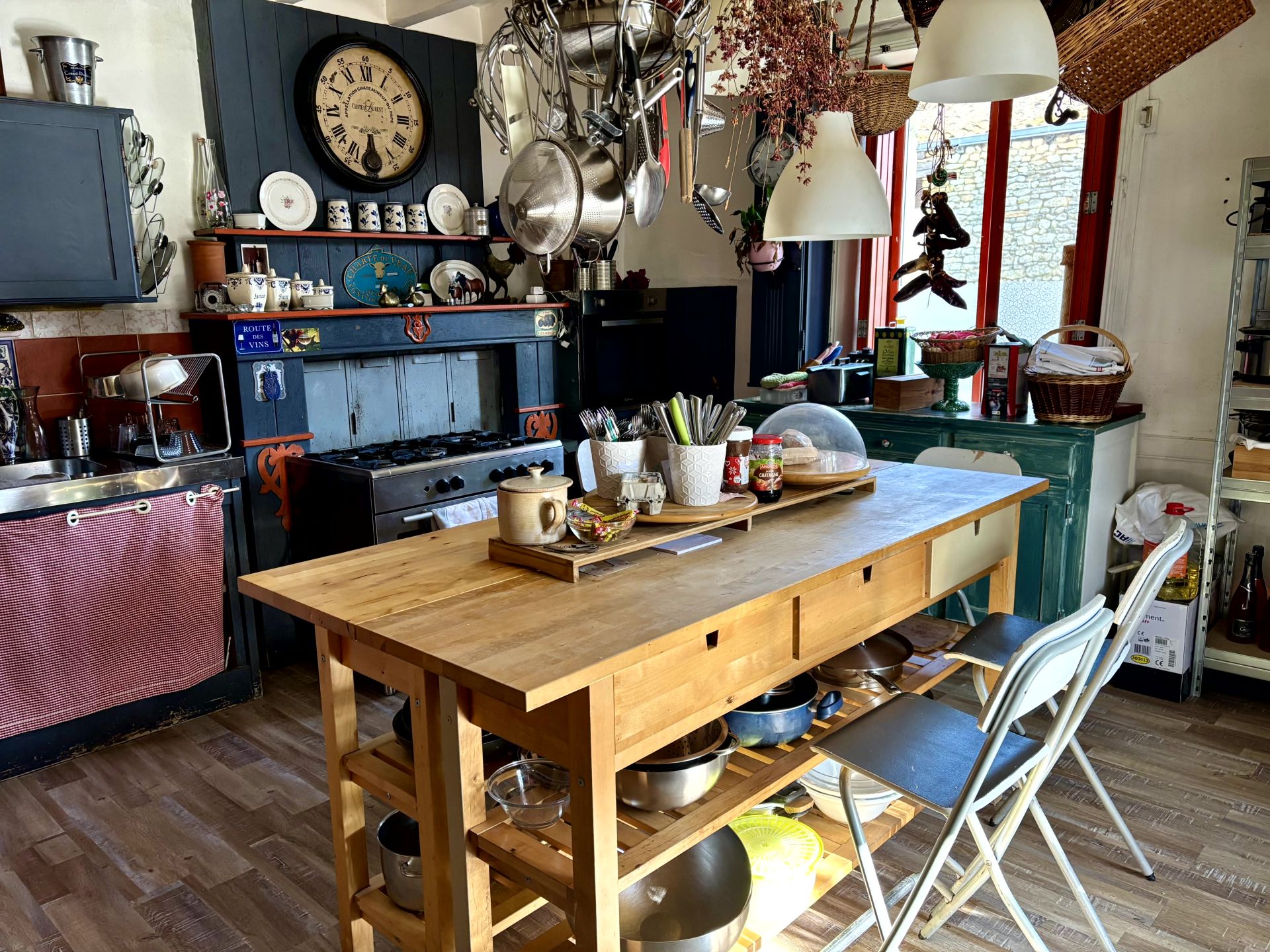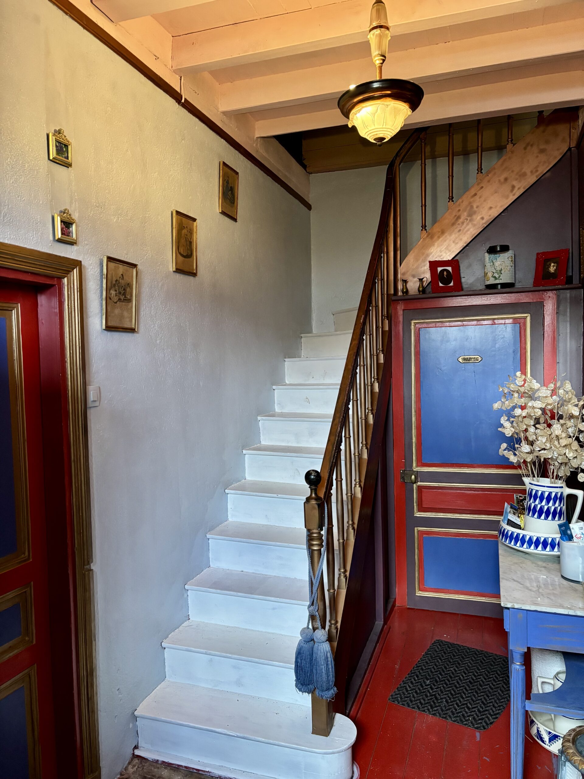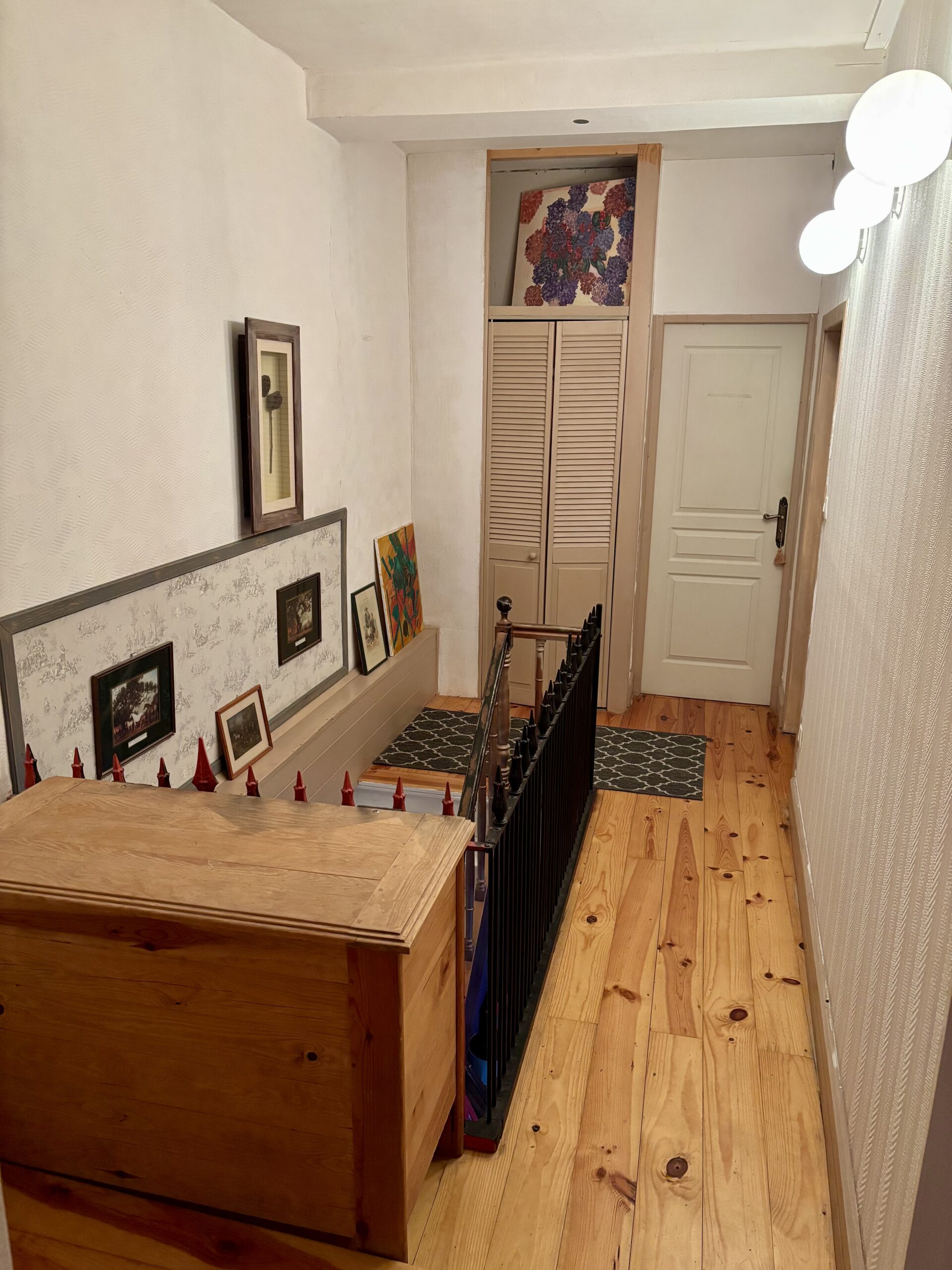 La maison dispose d’une cuisine équipée, d’un grand salon, une salle à manger, un hall d’entrée avec escalier (un WC en bas) et une buanderie (sèche linge, lave linge, fer à repasser).